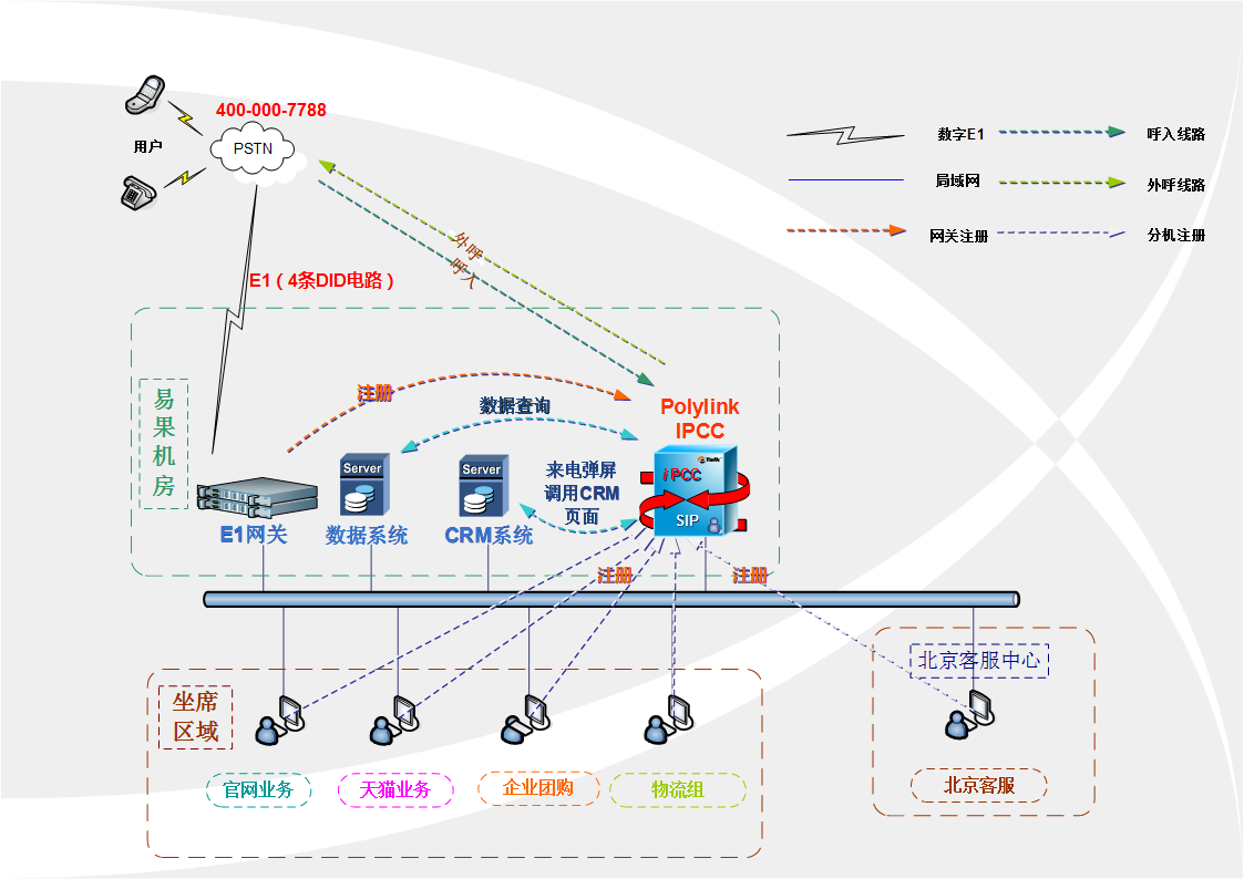 Polylink IPCC-500呼叫中心平臺(tái)具備靈活性和分布式應(yīng)用,既可以滿足前期小規(guī)模坐席的建設(shè)需求,又滿足了易果呼叫中心快速擴(kuò)容的需求,不但系統(tǒng)實(shí)施快捷,管理維護(hù)簡(jiǎn)易,而且提供7*24小時(shí)服務(wù),為用戶提供貼心服務(wù)質(zhì)量。